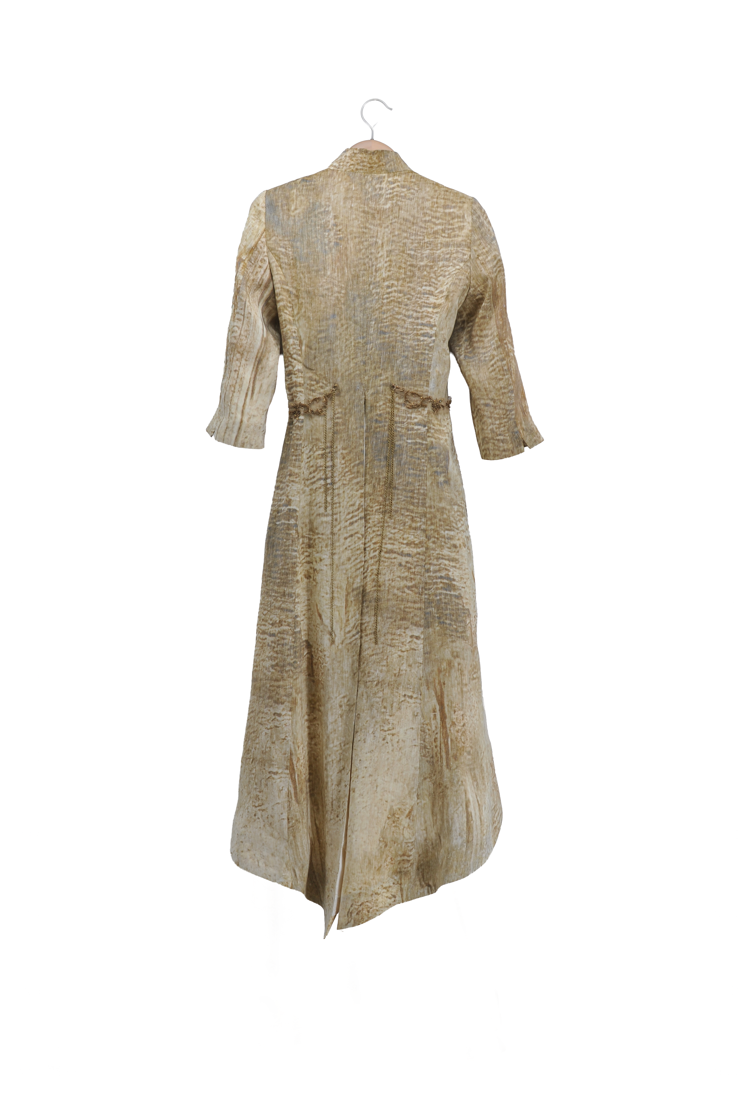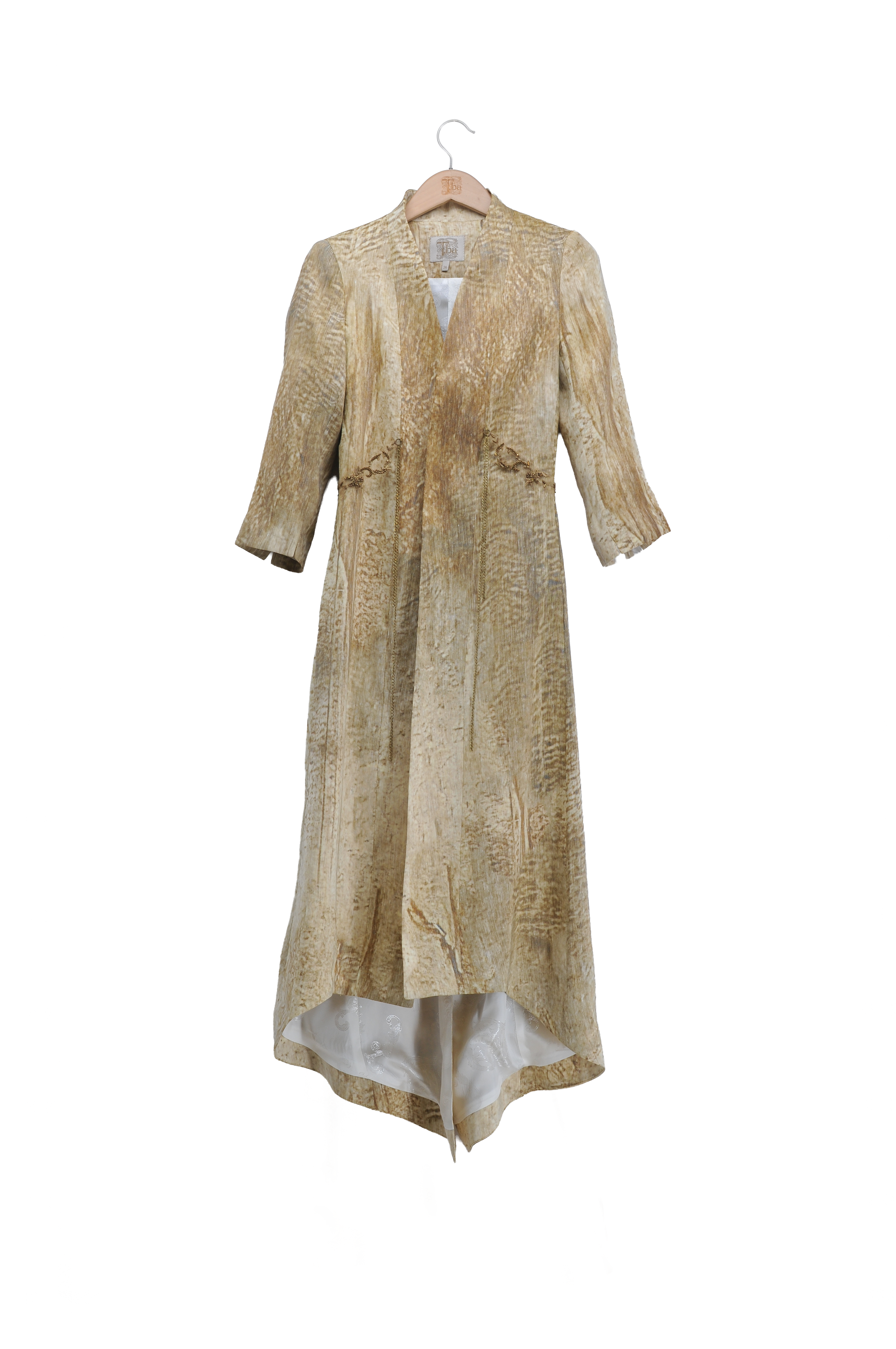 Mid-length tailored coat with a fitted waist and gently flared skirt. Features a V-neckline without lapels, three-quarter sleeves, and decorative embroidered waist tabs with hanging chain details. The hem is slightly longer at the back, and the interior is partially lined.