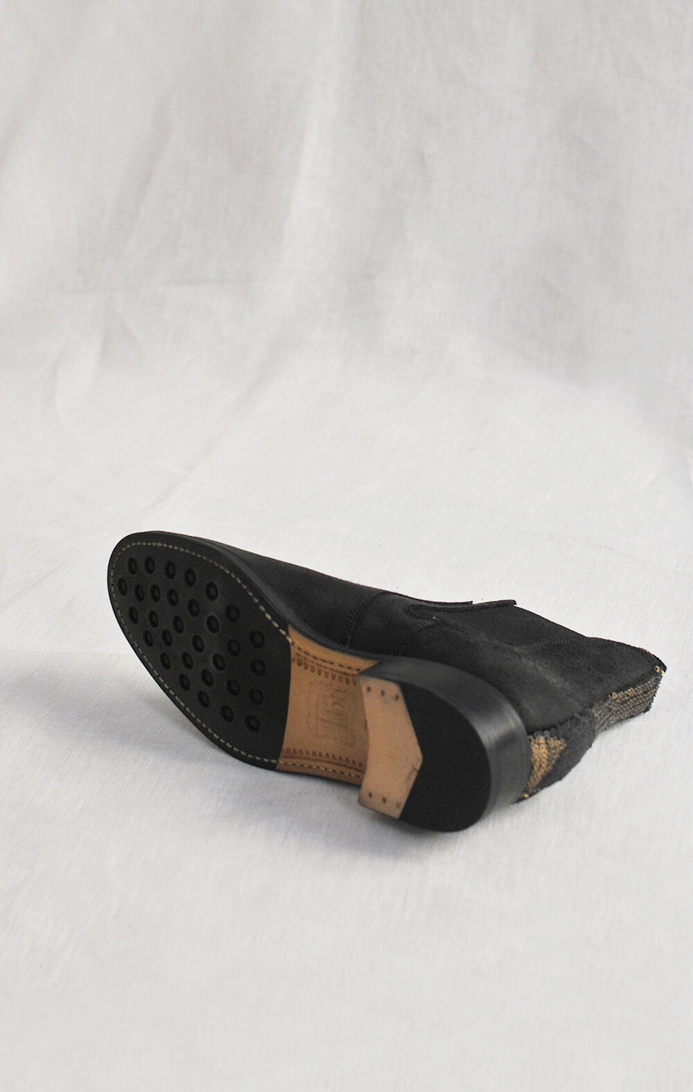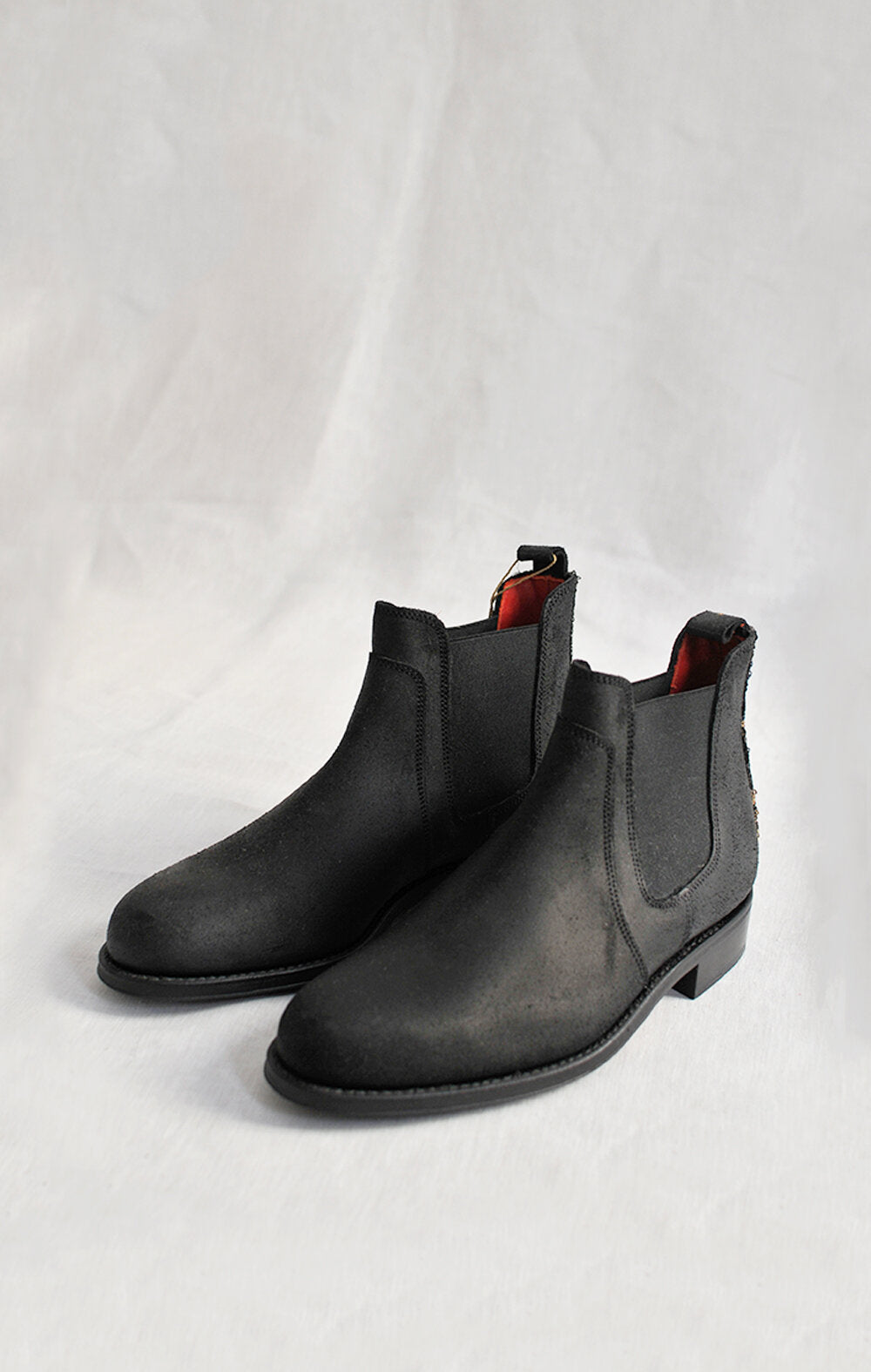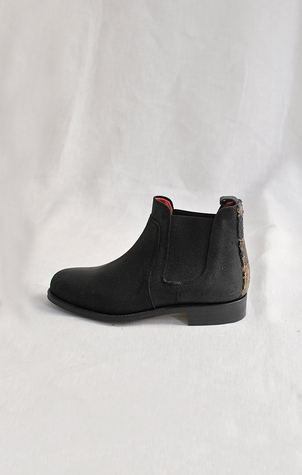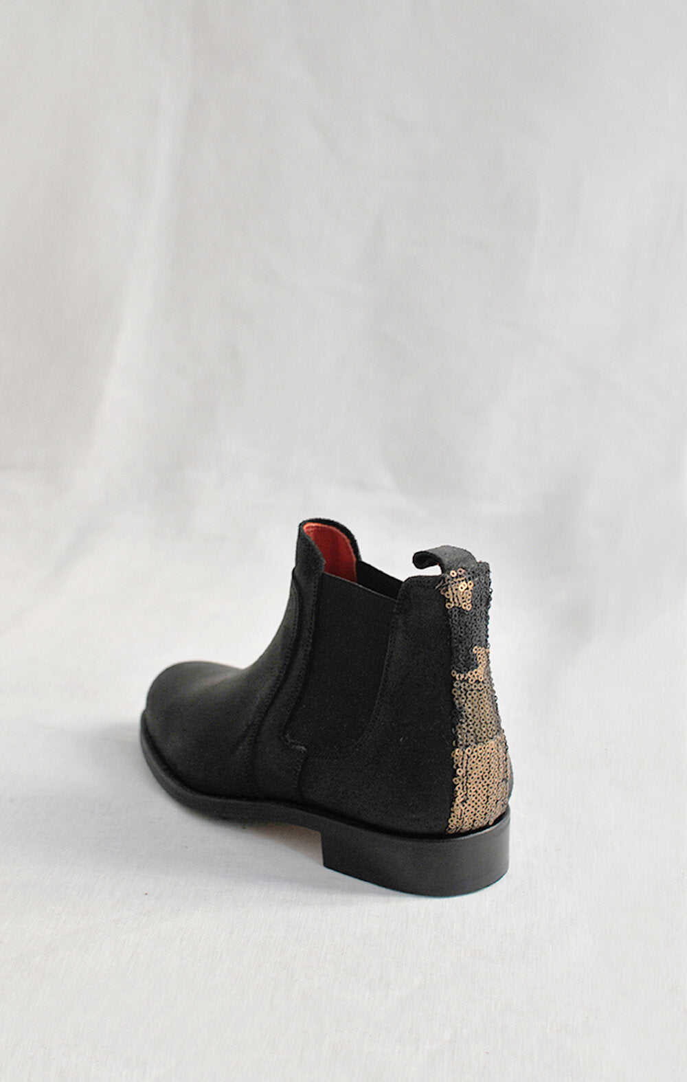 Leather ankle boots, with metallic sequins on the back, elastic contrasting on the sides and stitching details. Back pull tab for easy fitting.
