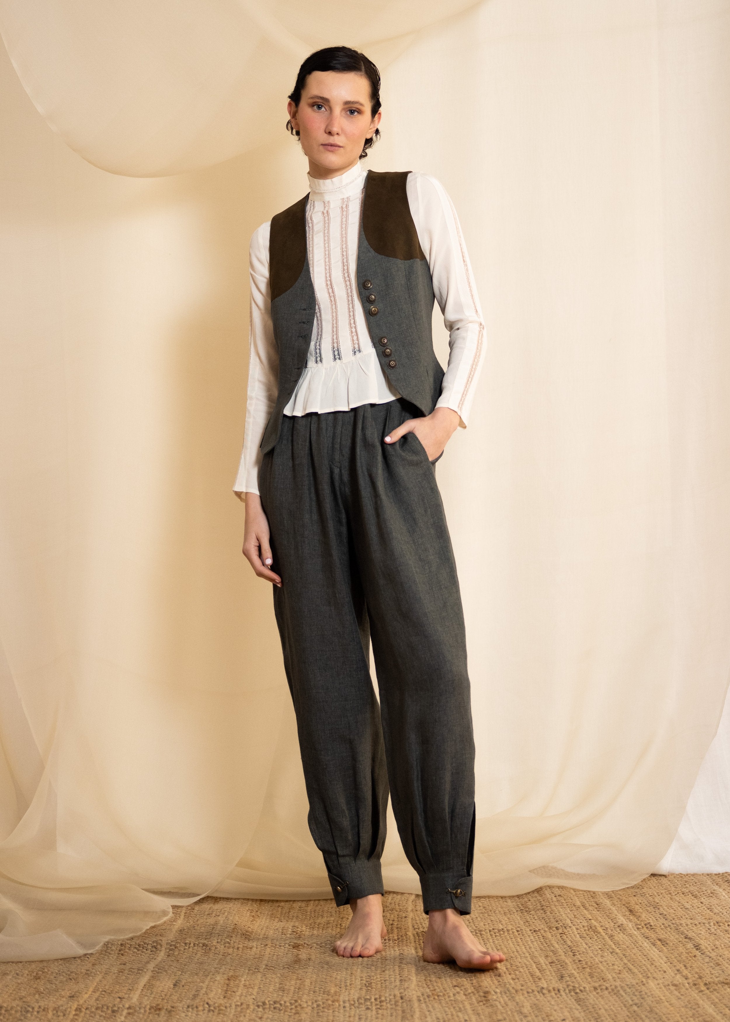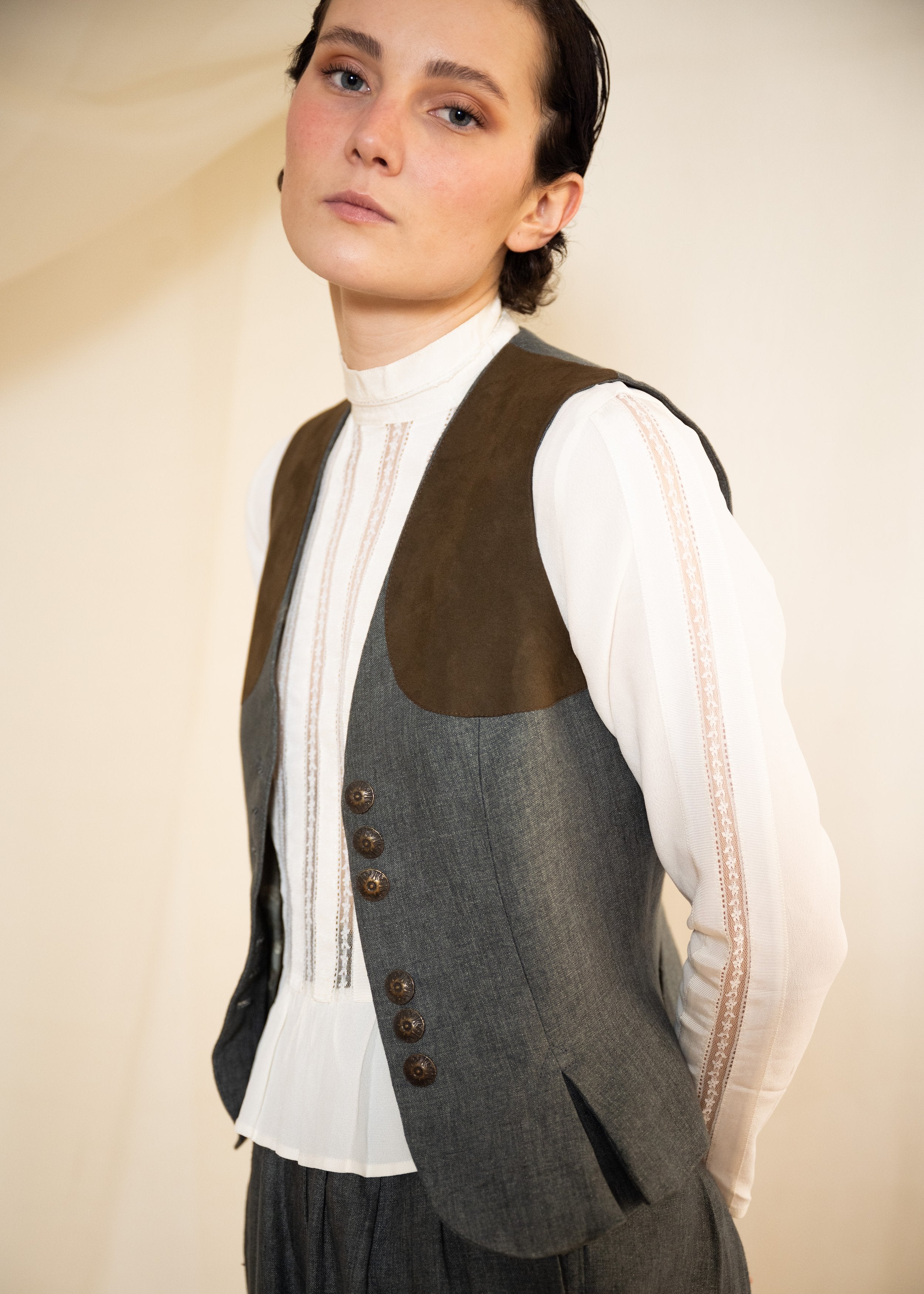 A blouse that embodies delicacy and femininity with a nostalgic touch. Crafted in a soft ivory tone, it features a refined high neckline and a subtle interplay of sheer panels with delicate lace inserts. The ruffled hem adds a romantic and ethereal touch. At the back, a subtle keyhole opening with a button closure introduces a hint of understated sophistication. A garment that merges classic charm with contemporary elegance, perfect for enhancing the natural grace of its wearer.