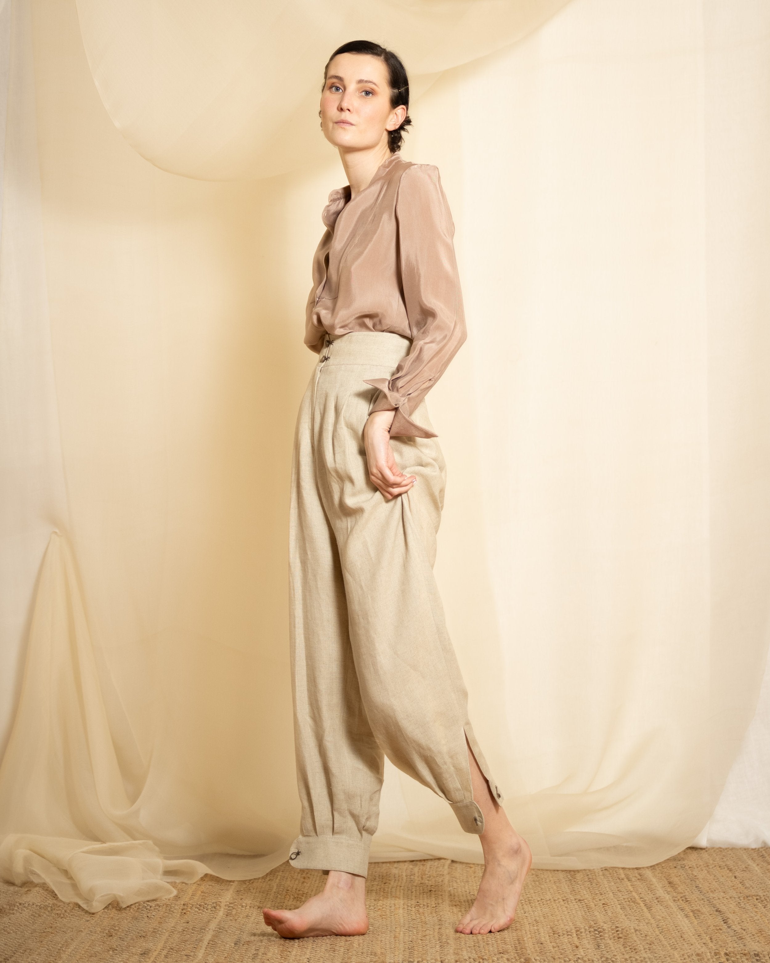 A blouse of quiet refinement. With a soft, fluid drape and subtle tailoring, it balances structure and ease in perfect harmony. Its timeless silhouette and muted tone make it a gentle companion for thoughtful days and unhurried evenings.