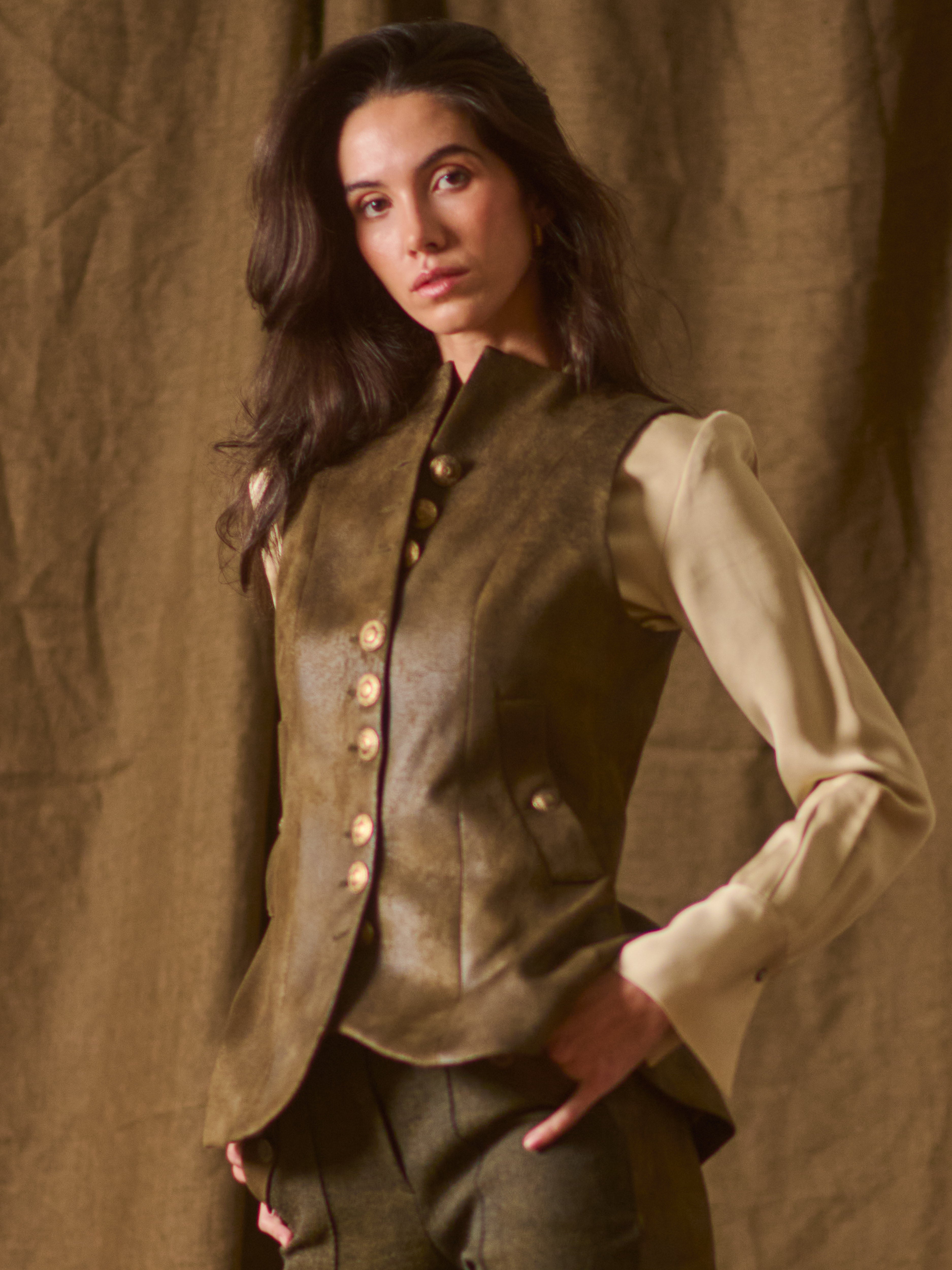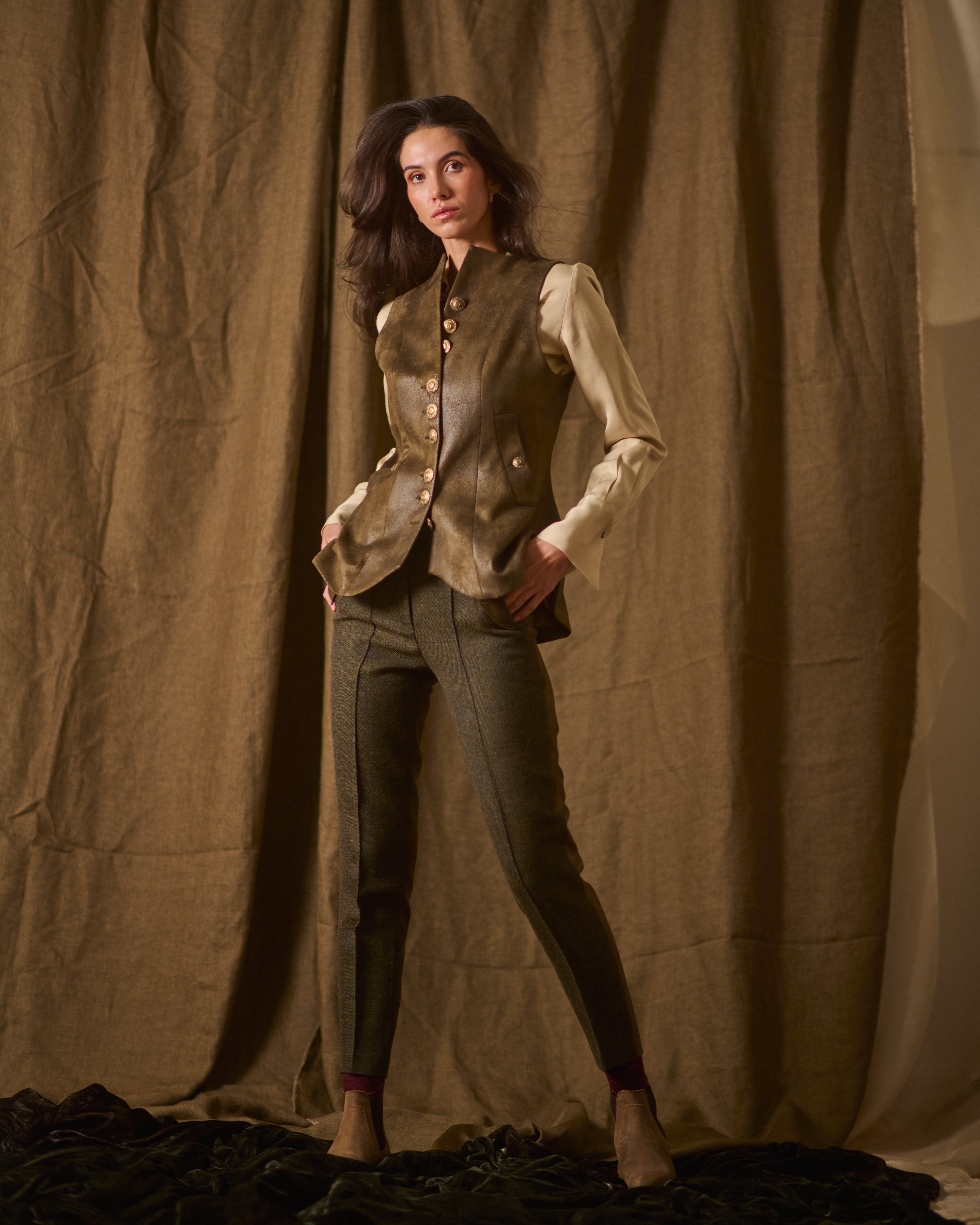 The Baltea Vest in Gnu fabric features a fitted silhouette with a structured front and a slight flare at the hem. Detailed with metallic buttons and welt pockets, it balances classic tailoring with contemporary refinement. Its clean lines and defined shape make it versatile—ideal for layering over shirts or dresses, adding elegance and structure to any look.