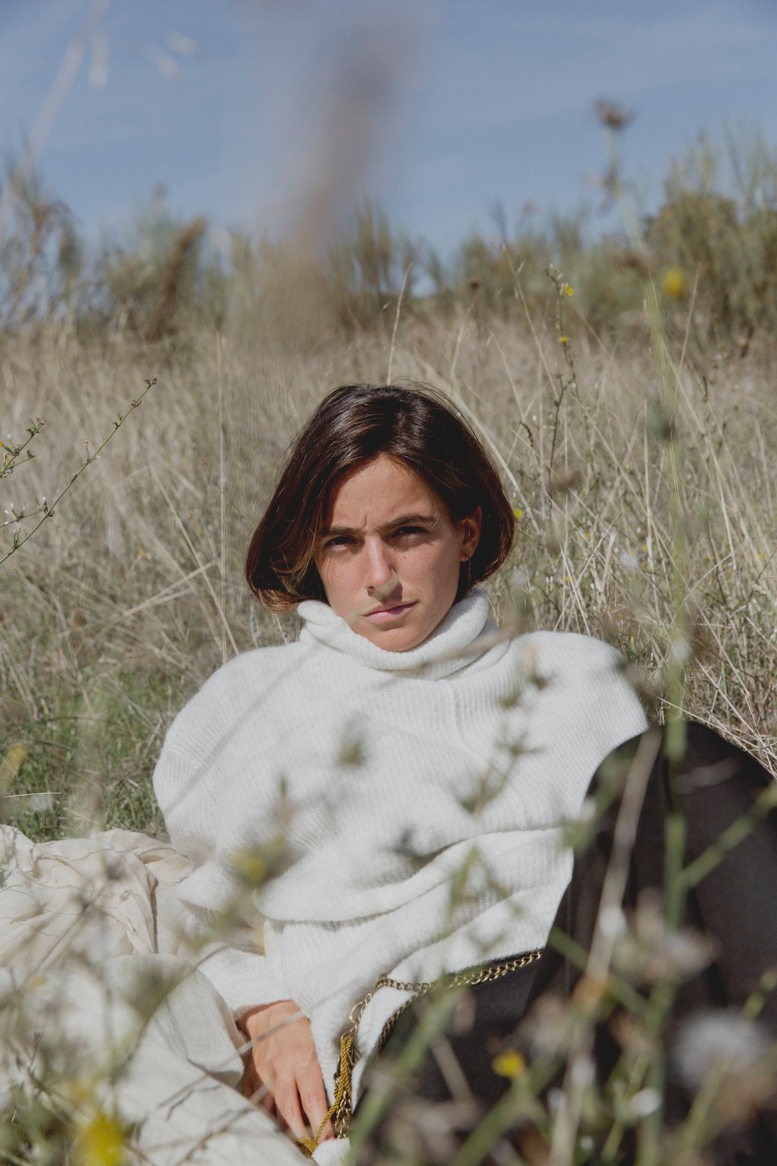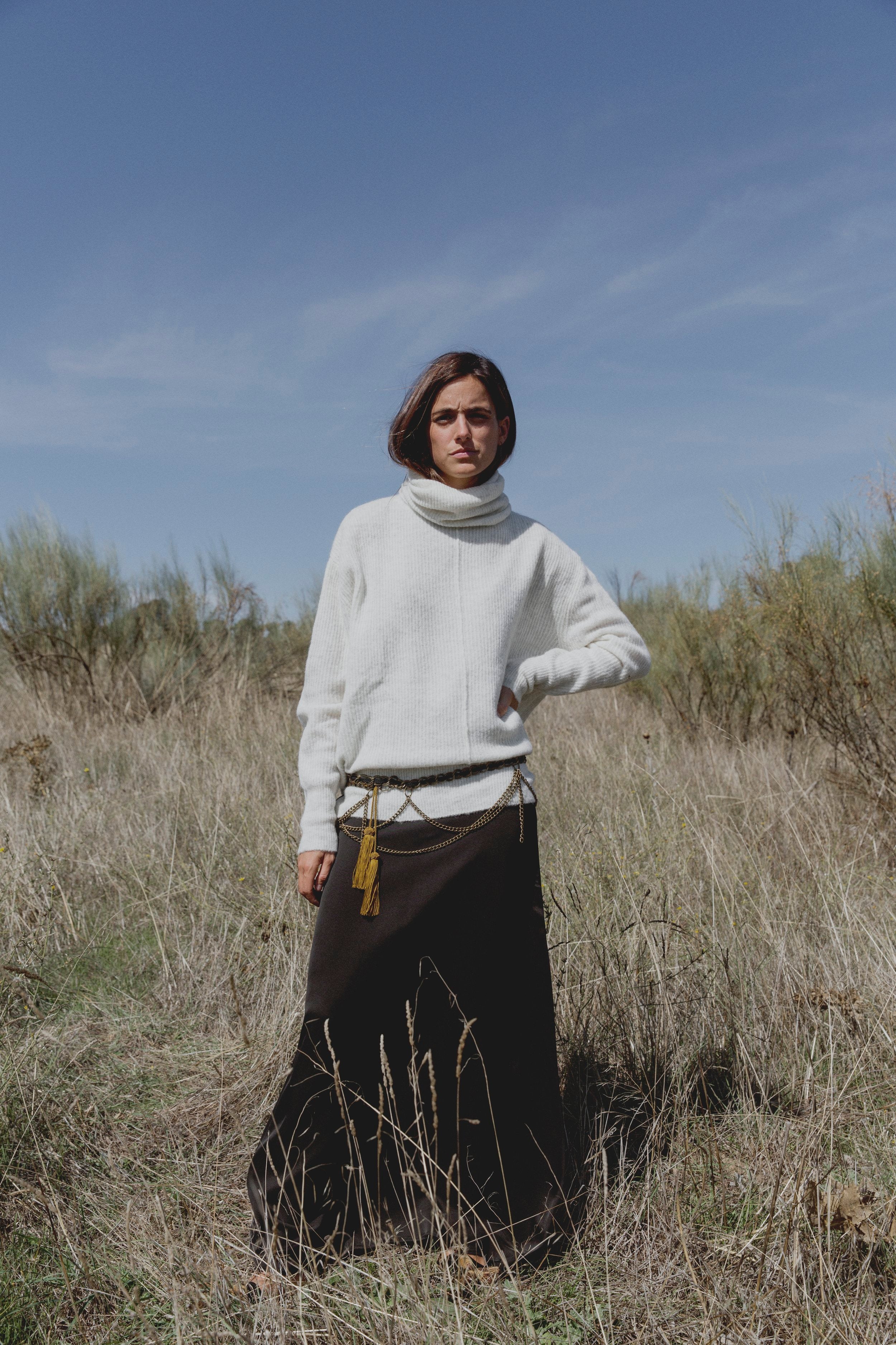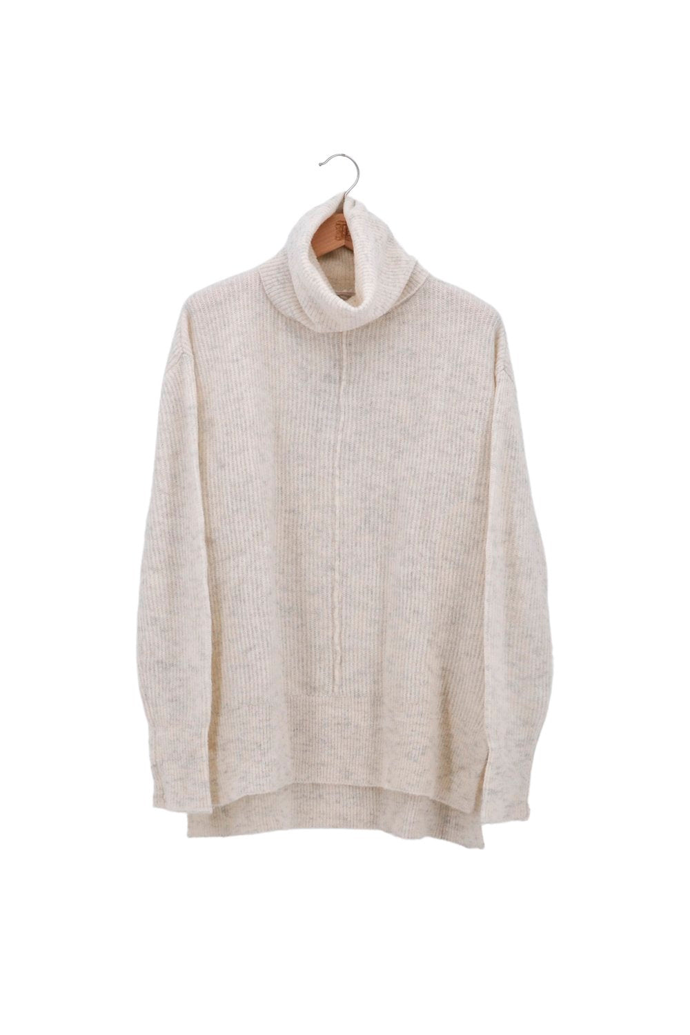 Knit jumper with mixture of wool an alpaca. Turtleneck. Long sleeve. Loose fit and below the hip length. Ice color.