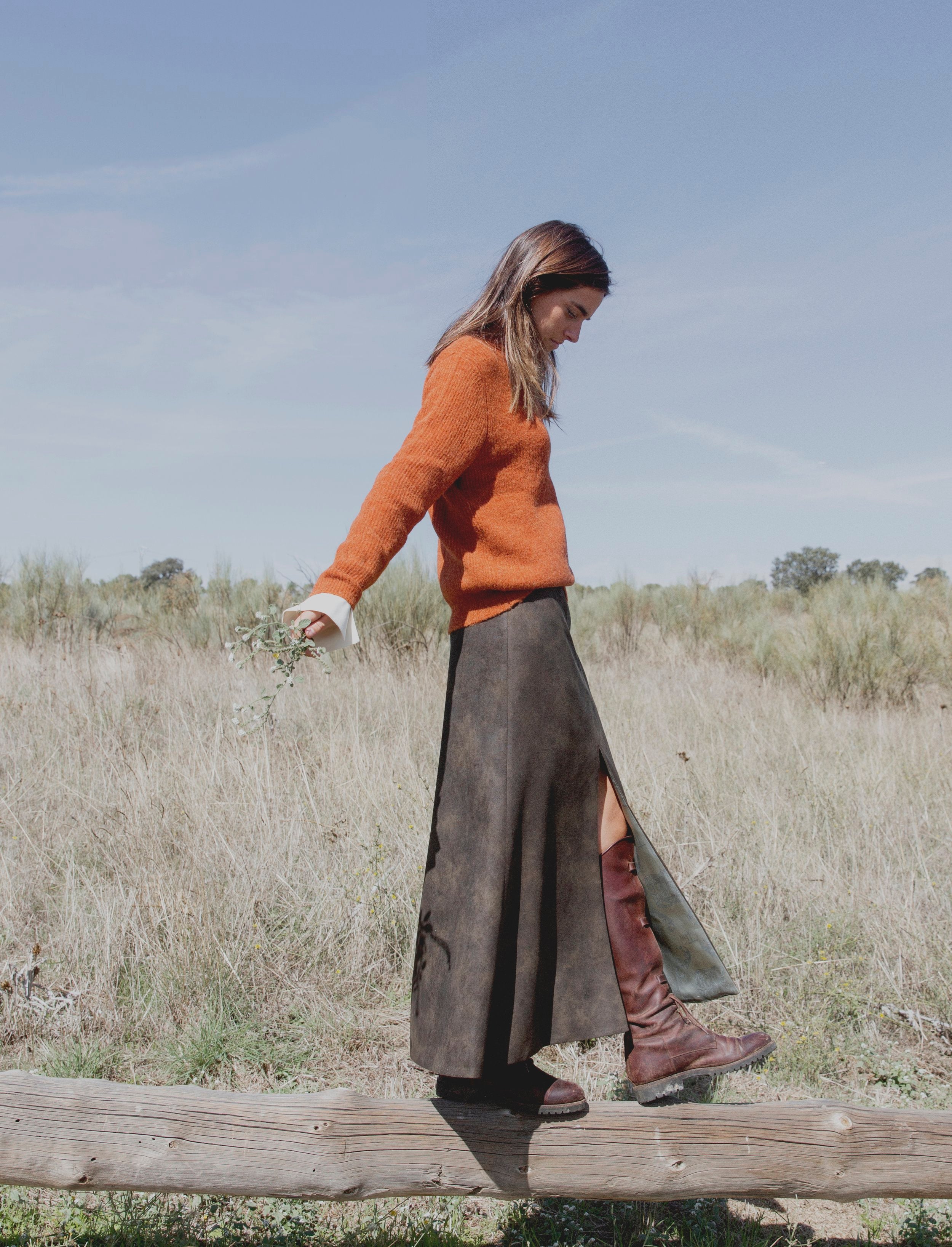Knit Jumper with mixture of wool and alpaca. Square neck. Long sleeve. Regurlar fit, straight and hip length. Color Brick.