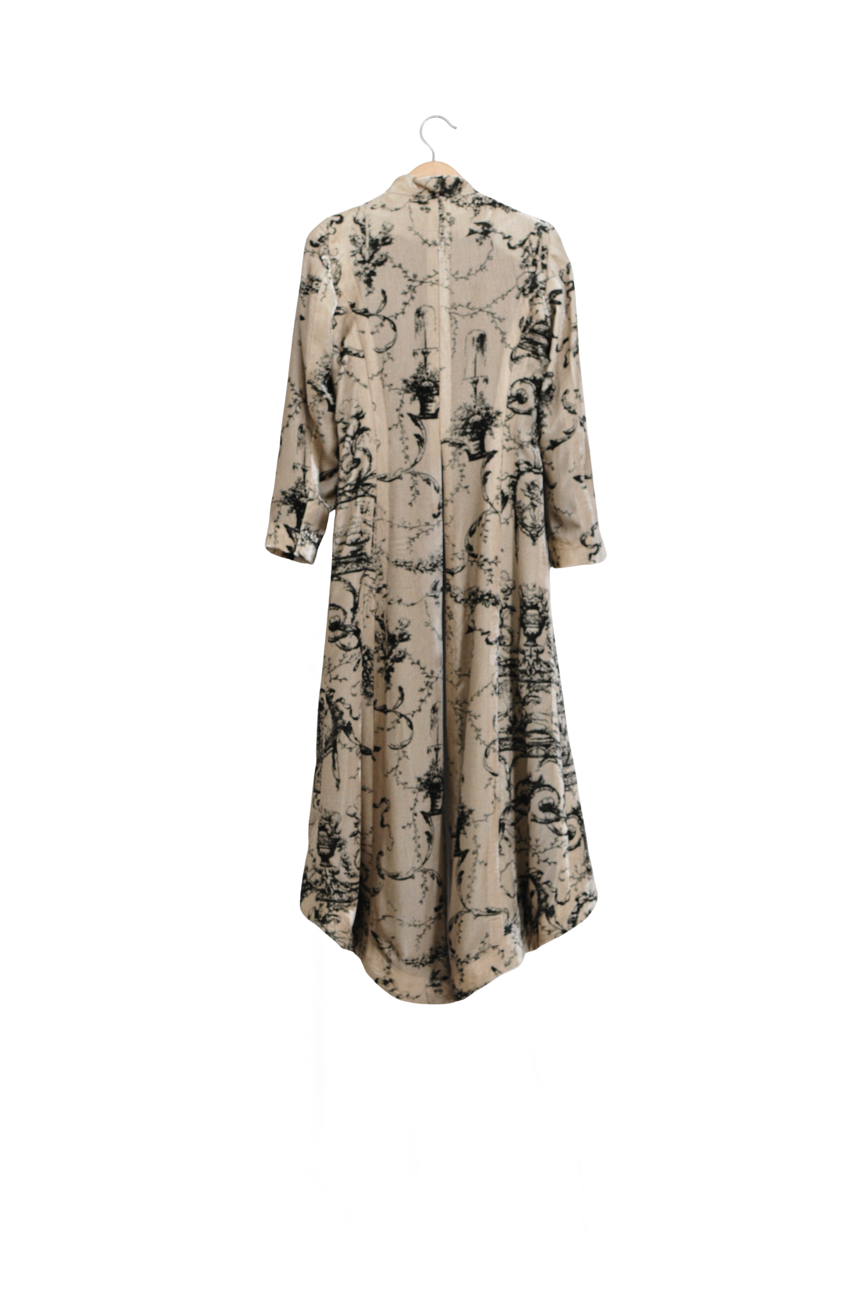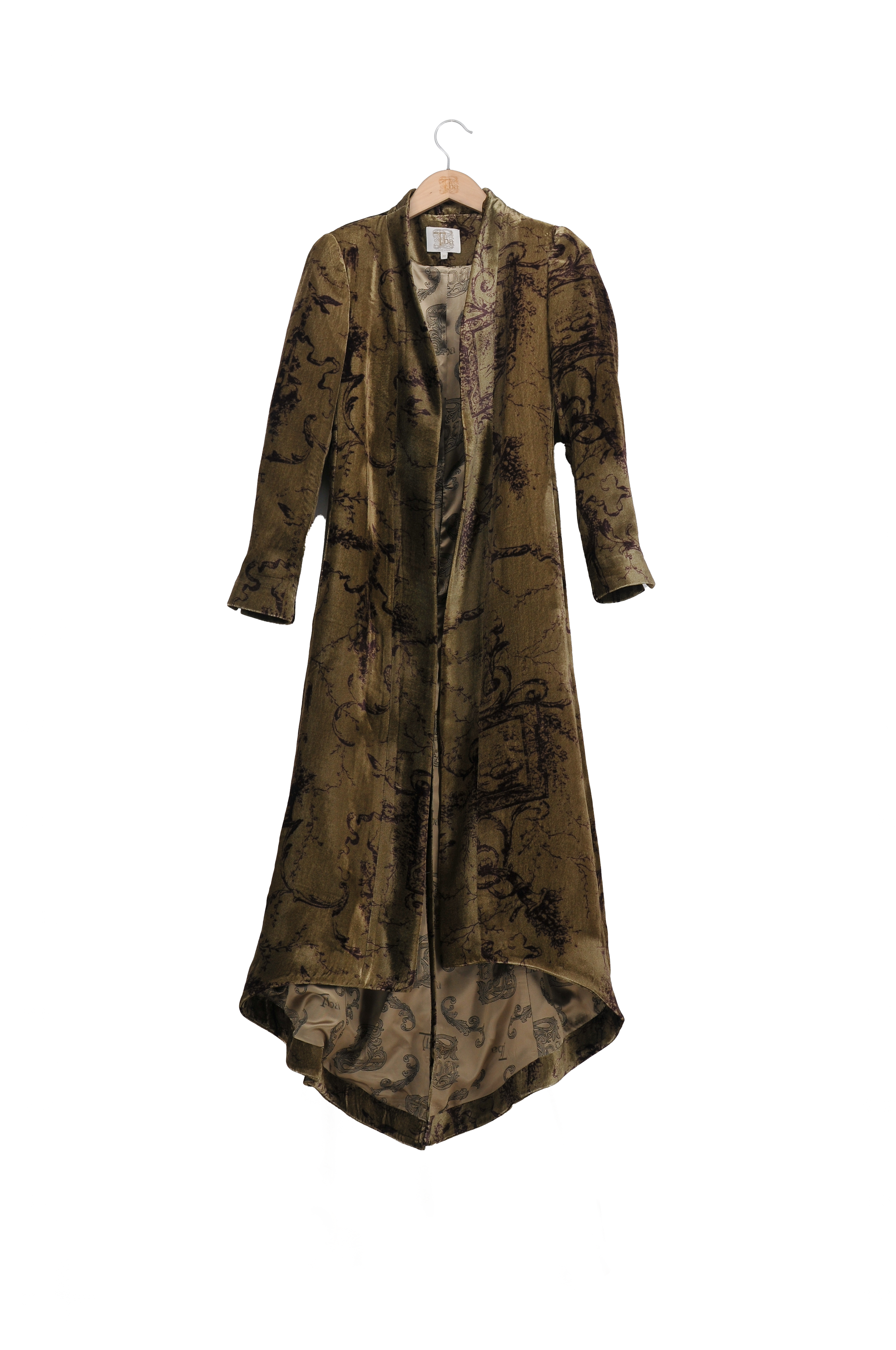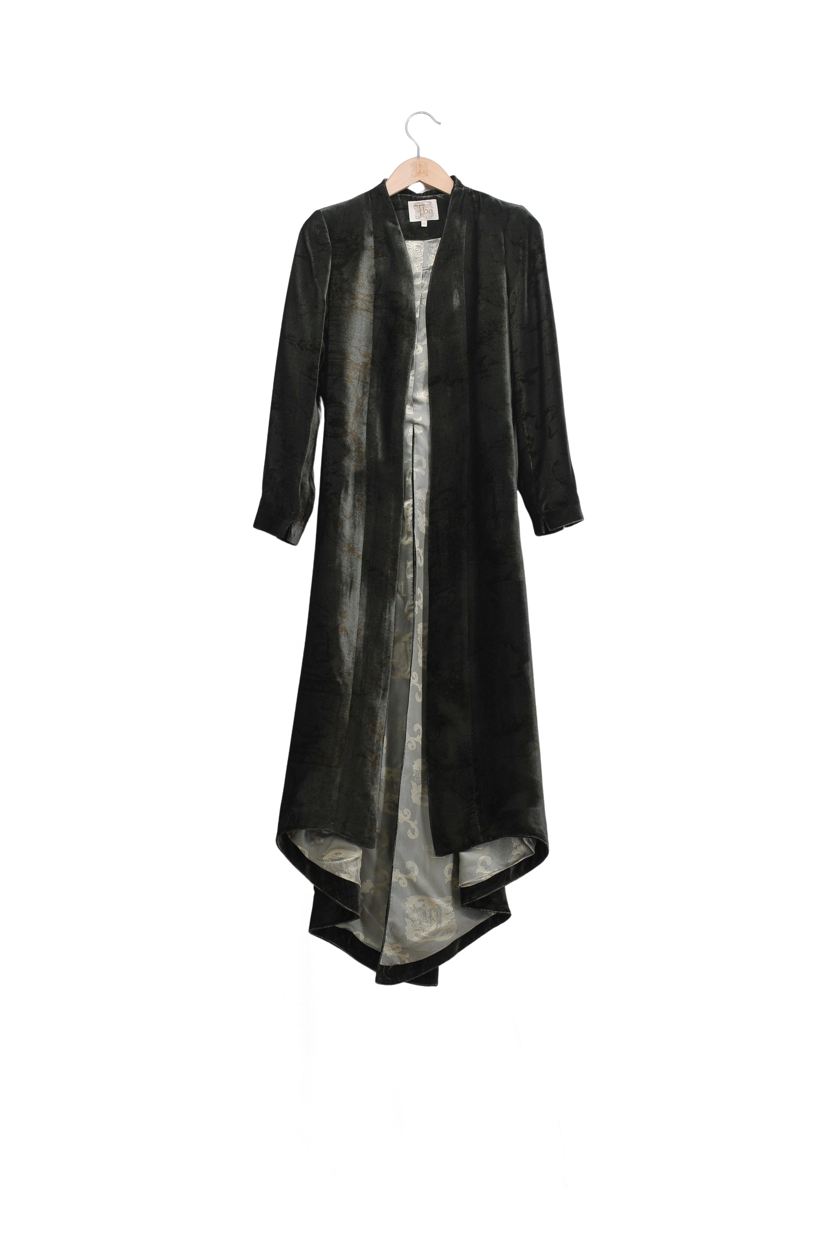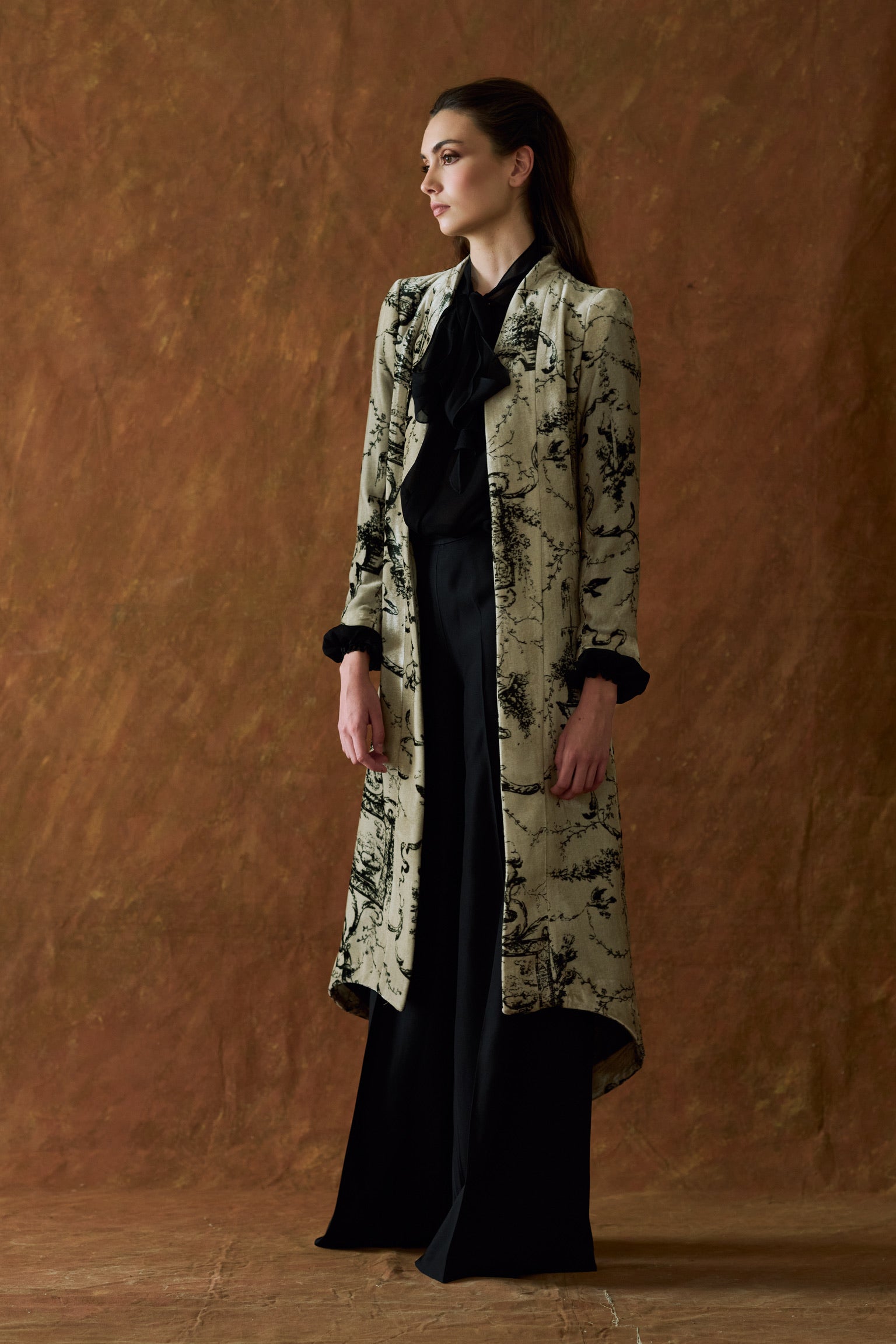 The Ginebra Coat is made from a soft silk velvet fabric with a subtle printed design that gives depth and texture to its surface. It features a long, structured silhouette with a straight cut through the body and a slightly elongated back hem. The open front design keeps the look clean and minimal, while long sleeves and tailored seams ensure a smooth, flattering fit. Fully lined with a silky patterned fabric for comfort and durability, this coat combines refined materials with precise construction, ideal for day-to-night transitions or formal layering.