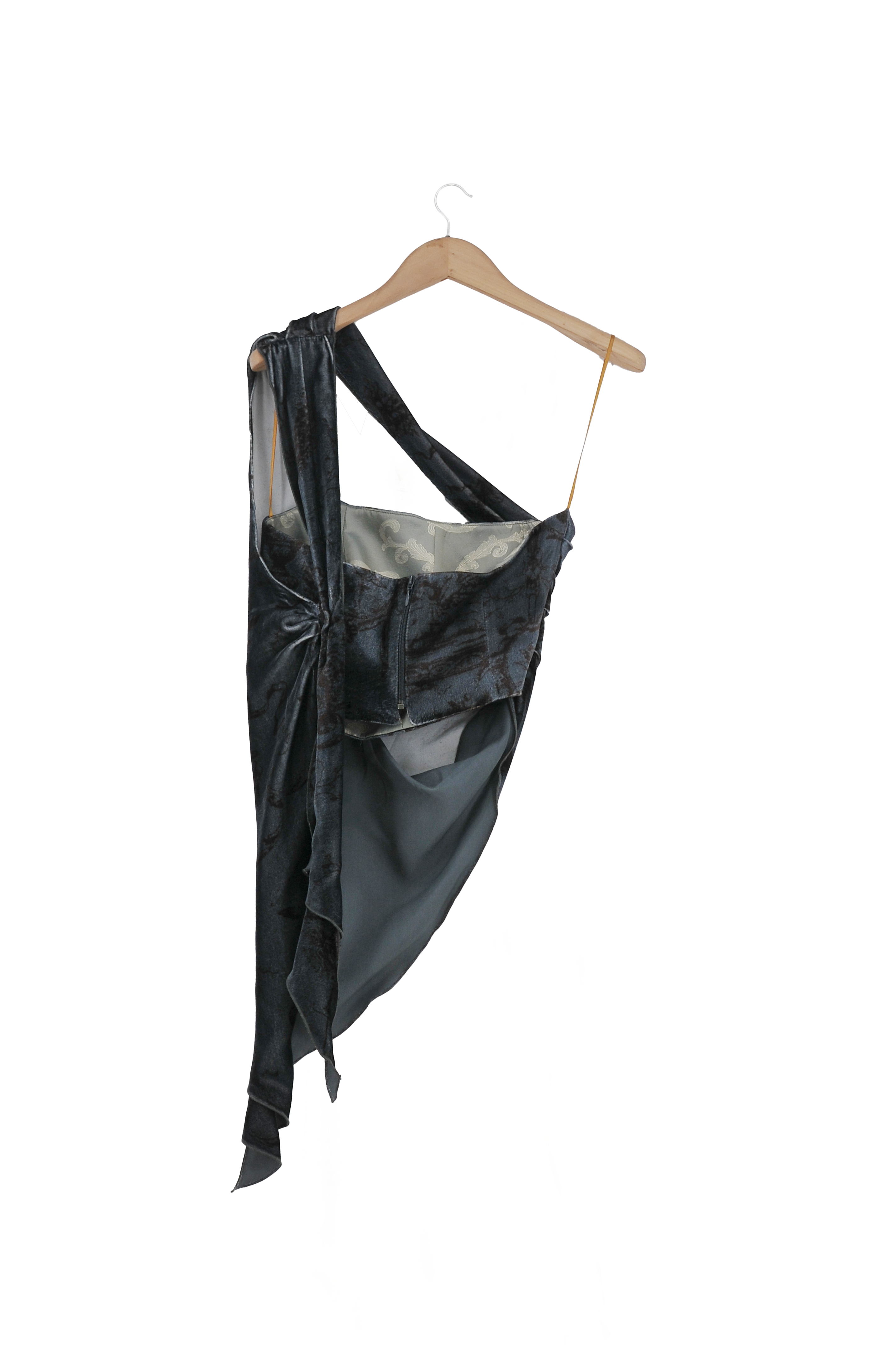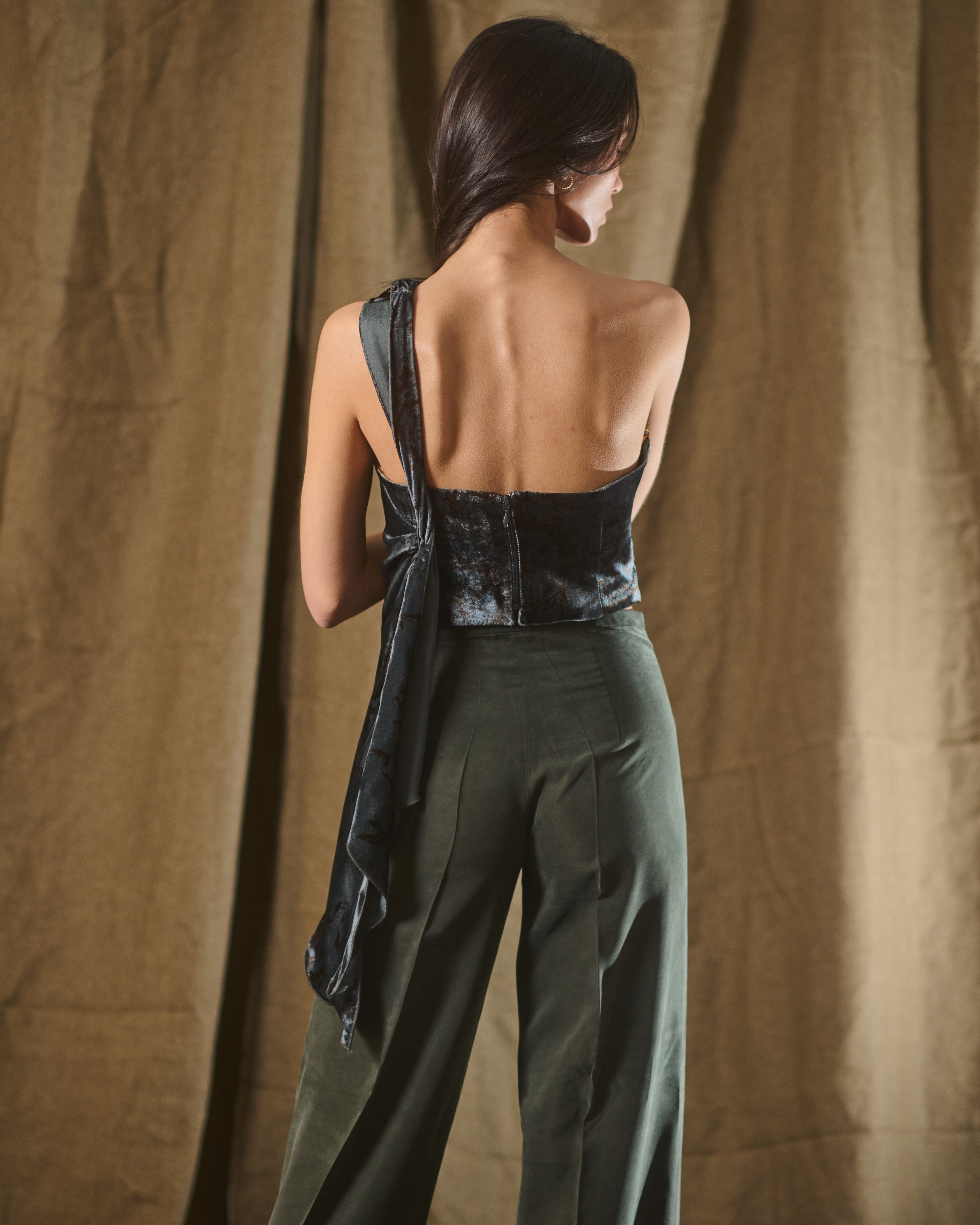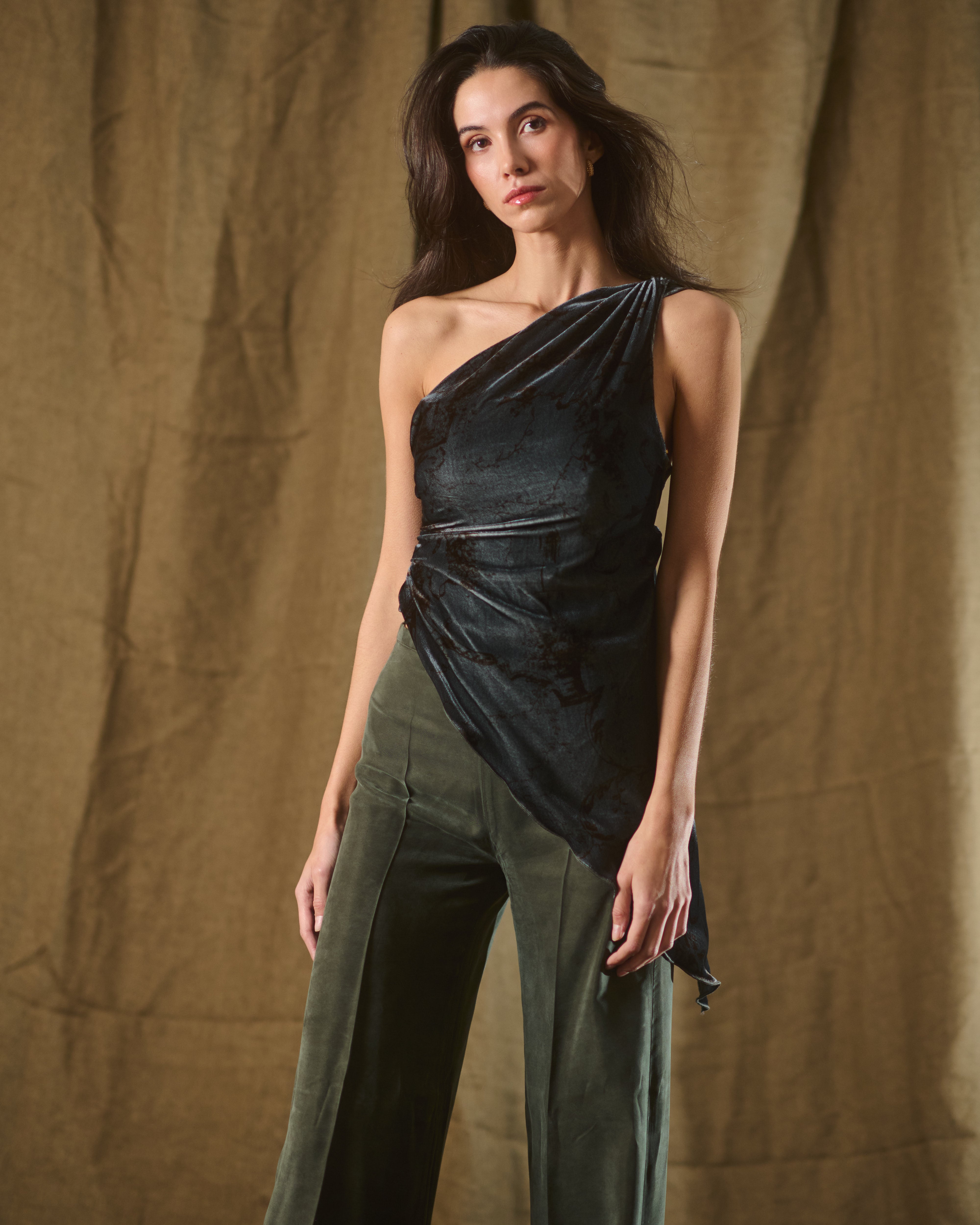 Crafted from silk velvet, the Pienza Top features an asymmetric neckline with a single shoulder strap and fluid draping that enhances its sculptural silhouette. Finished with a discreet side zip, it combines rich texture and elegant structure for a refined, modern look.