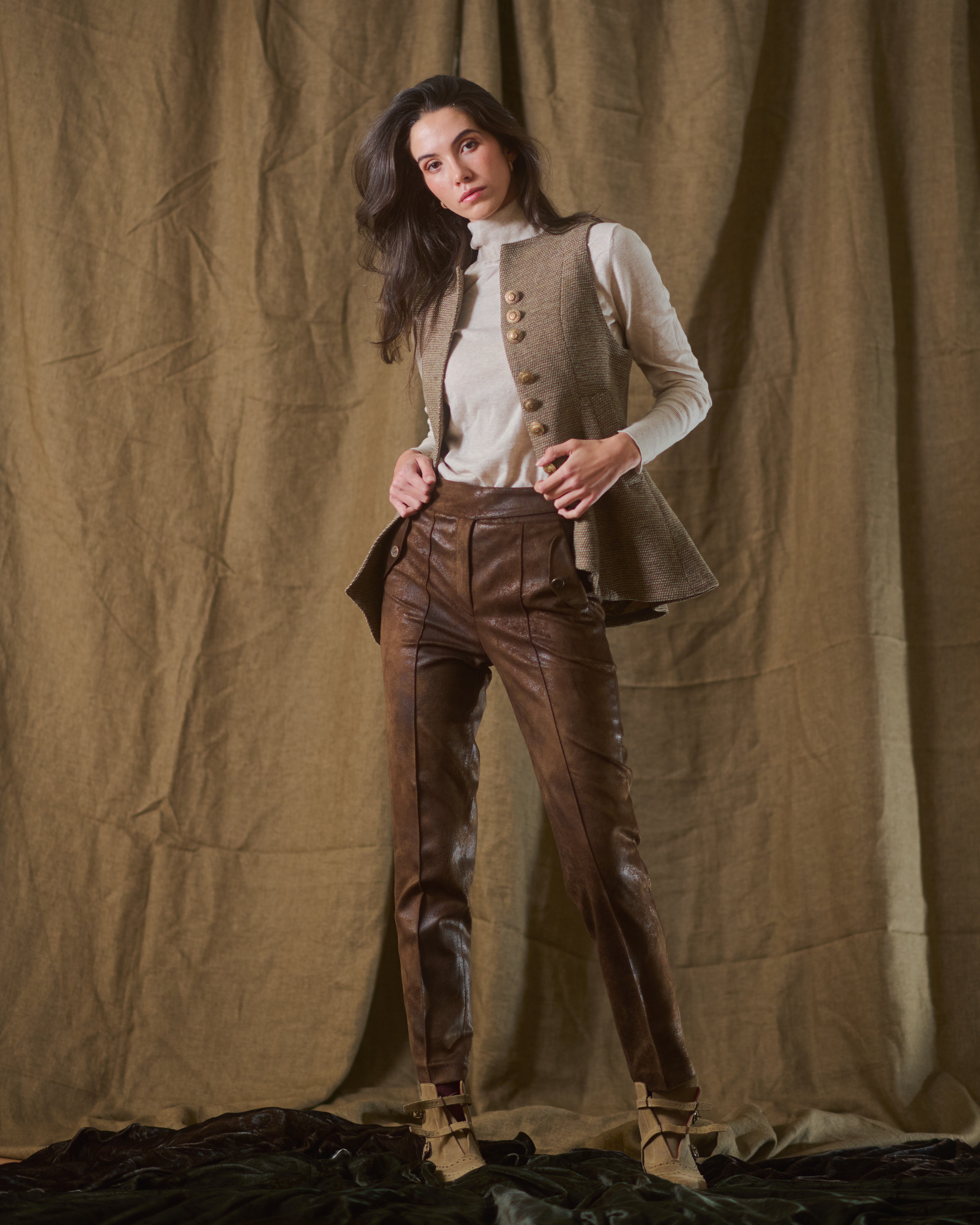 The Baltea Vest in Tweed Knit fabric features a fitted silhouette with a structured front and a slight flare at the hem. Detailed with metallic buttons and welt pockets, it balances classic tailoring with contemporary refinement. Its clean lines and defined shape make it versatile—ideal for layering over shirts or dresses, adding elegance and structure to any look.