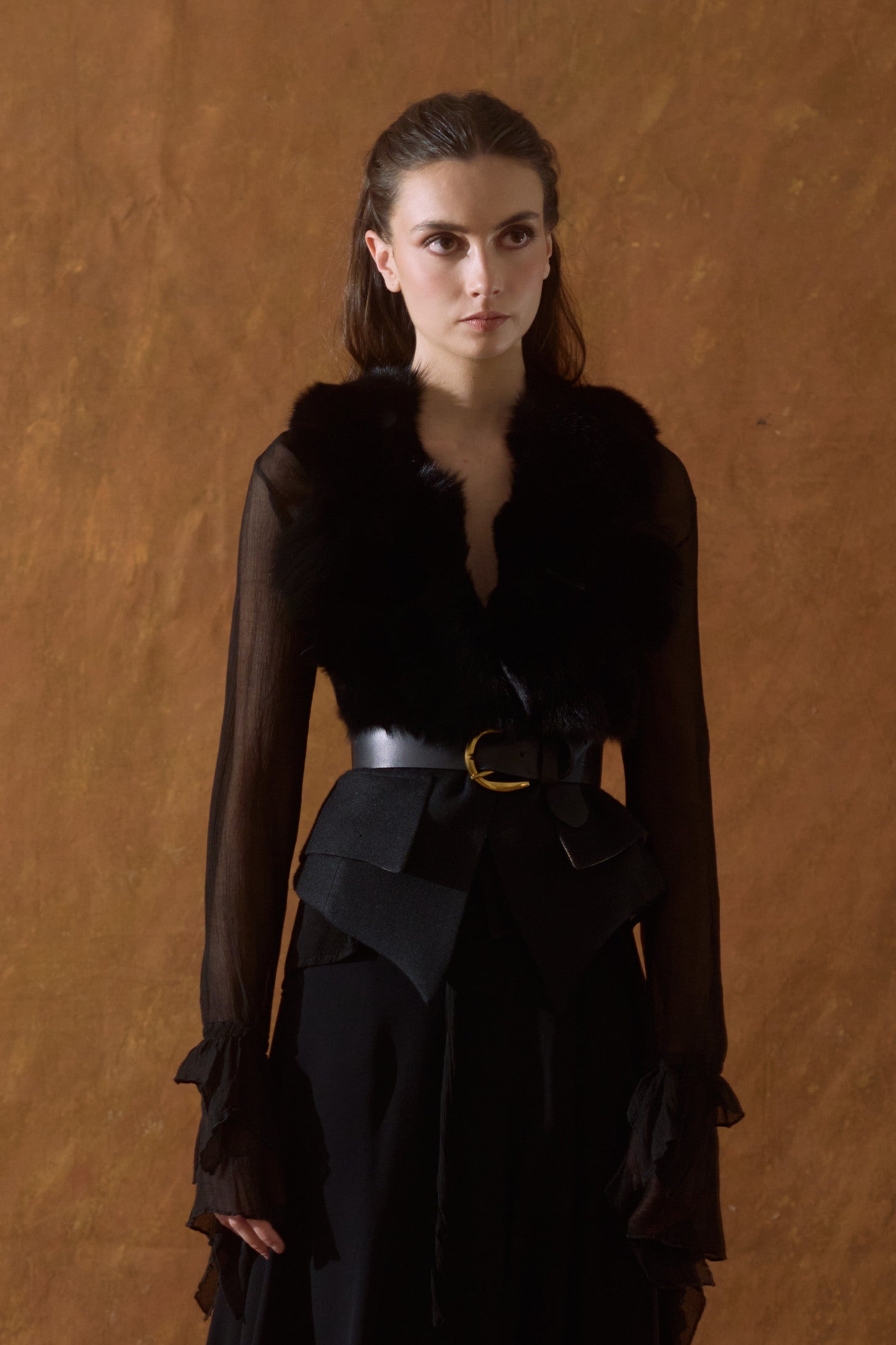 The Verdi Waistcoat in "Jerez" wool combines a tailored cut with rich texture. It features a full fur trim along the collar and front opening, creating a striking contrast against the smooth wool body. Two front flap pockets and an extended back hem complete the design, giving the piece structure and sophistication while maintaining everyday versatility.