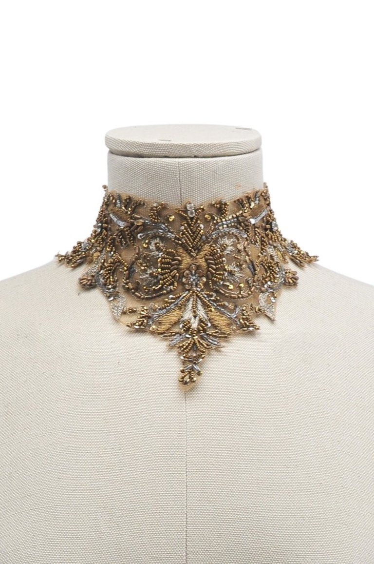 A jewel that needs no metal to shine. This choker, crafted from delicate lace and hand-embroidered with intricate beadwork, embraces the neck like a relic of artistry and mystery. Its baroque design and amber hue evoke the hidden treasures of forgotten palaces. Perfect for turning any outfit into a statement of theatrical elegance.