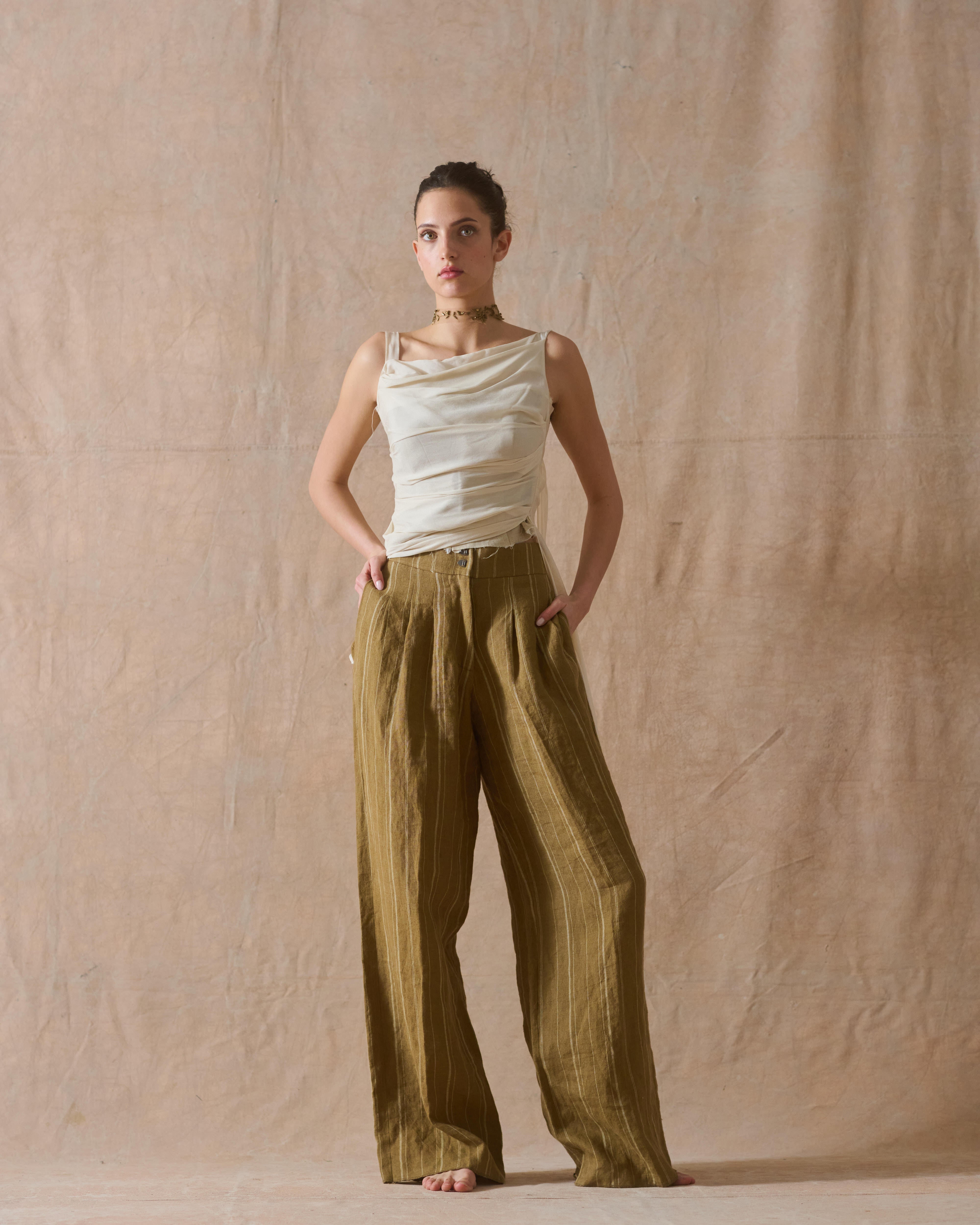 Top sin mangas con tirantes finos y silueta holgada. Parte delantera asimétrica con capas y una caída suave. La espalda presenta fruncido y un bajo más largo y puntiagudo en el centro. Confeccionado en crepé fino y ligero.