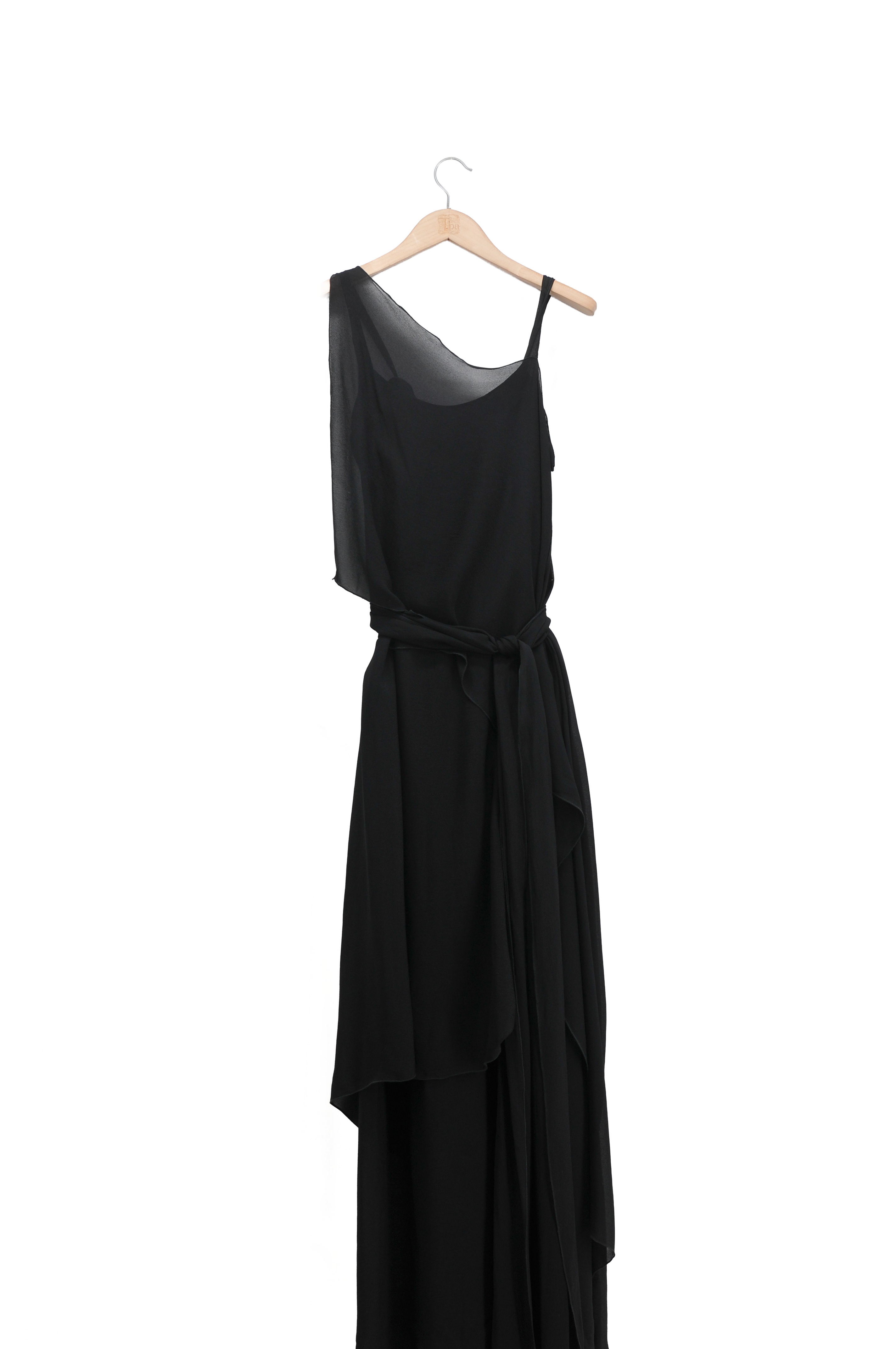 Vestido largo de crepé fino con escote asimétrico y tirantes finos. Las capas drapeadas y los paneles en cascada crean un movimiento fluido y una silueta suave y estilizada.