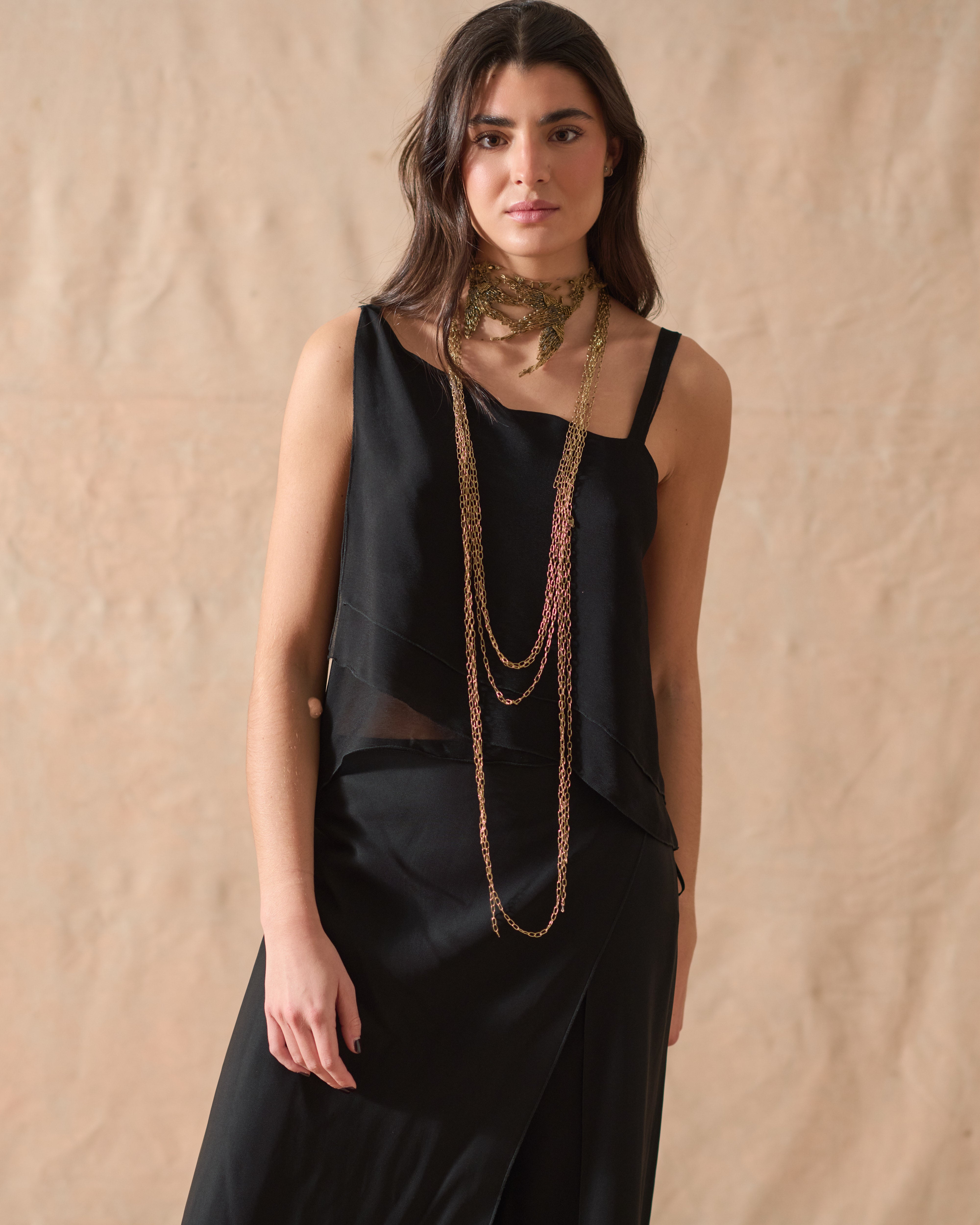 Top sin mangas con tirantes finos y silueta holgada. Parte delantera asimétrica con capas y una caída suave. La espalda presenta fruncido y un bajo más largo y puntiagudo en el centro. Confeccionado en crepé fino y ligero.