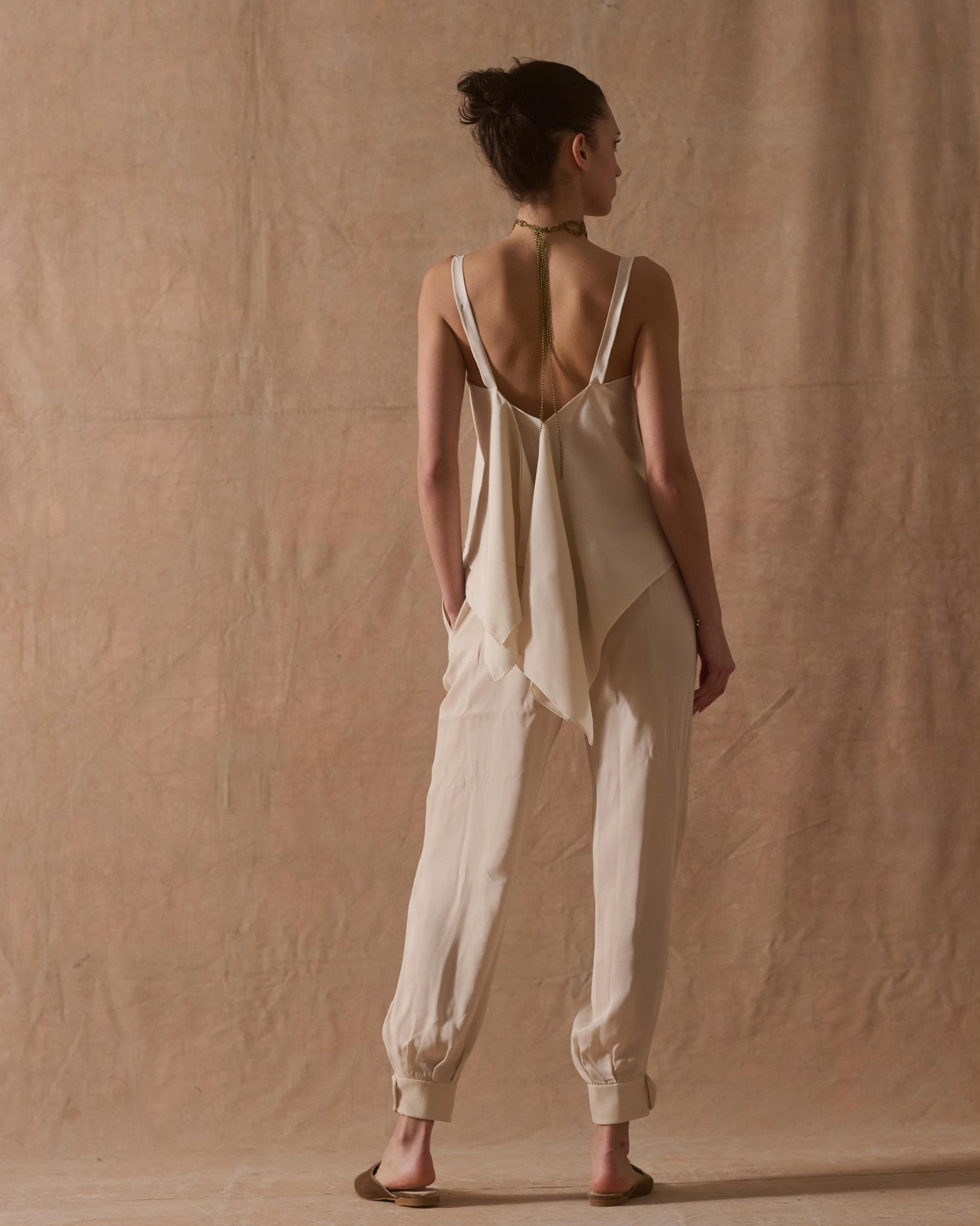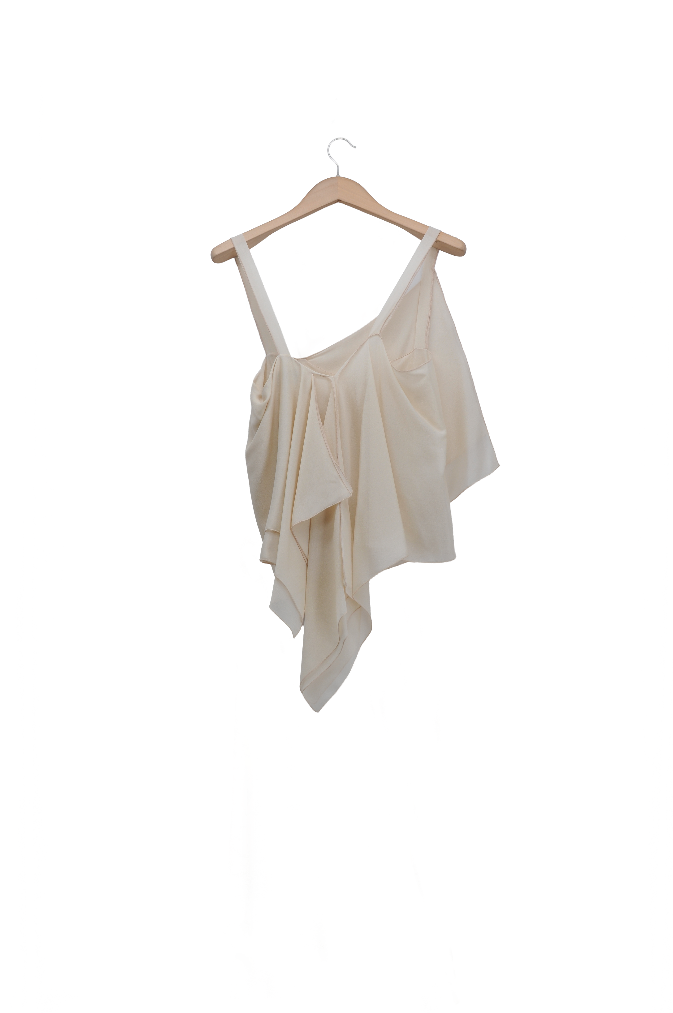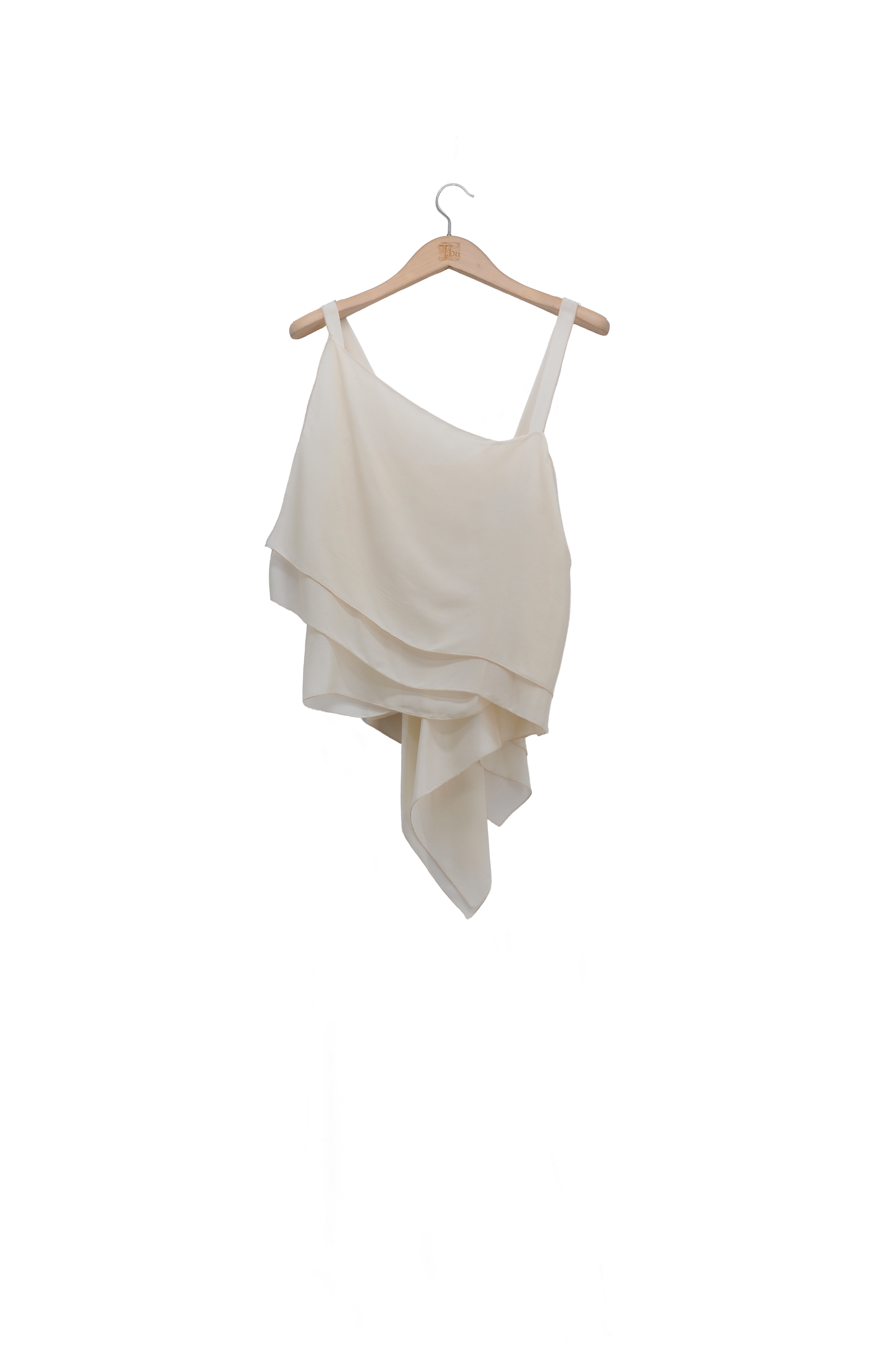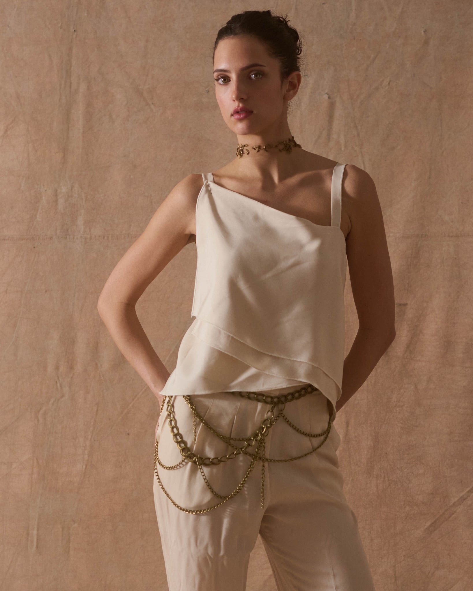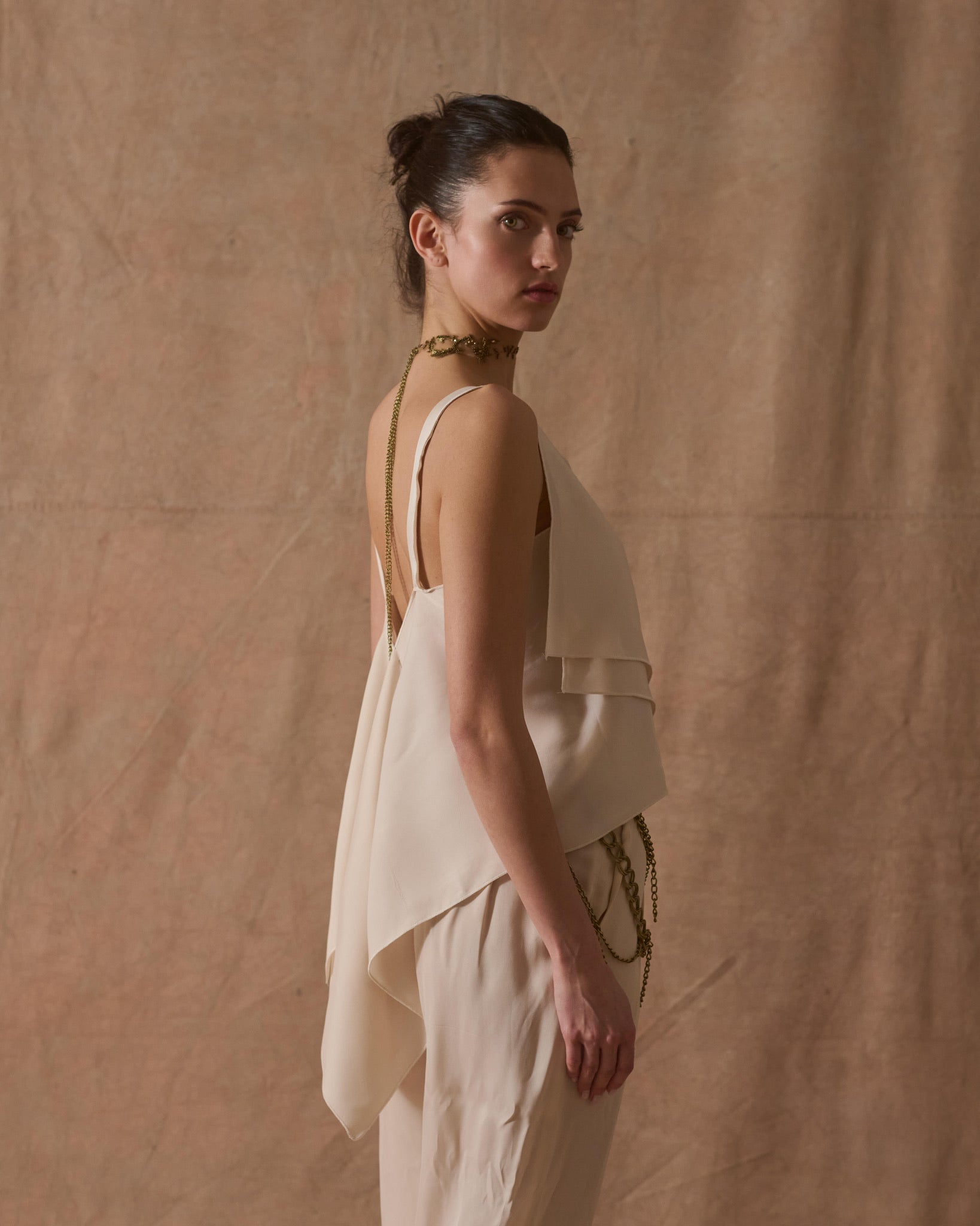 Top sin mangas con tirantes finos y silueta holgada. Parte delantera asimétrica con capas y una caída suave. La espalda presenta fruncido y un bajo más largo y puntiagudo en el centro. Confeccionado en crepé fino y ligero.